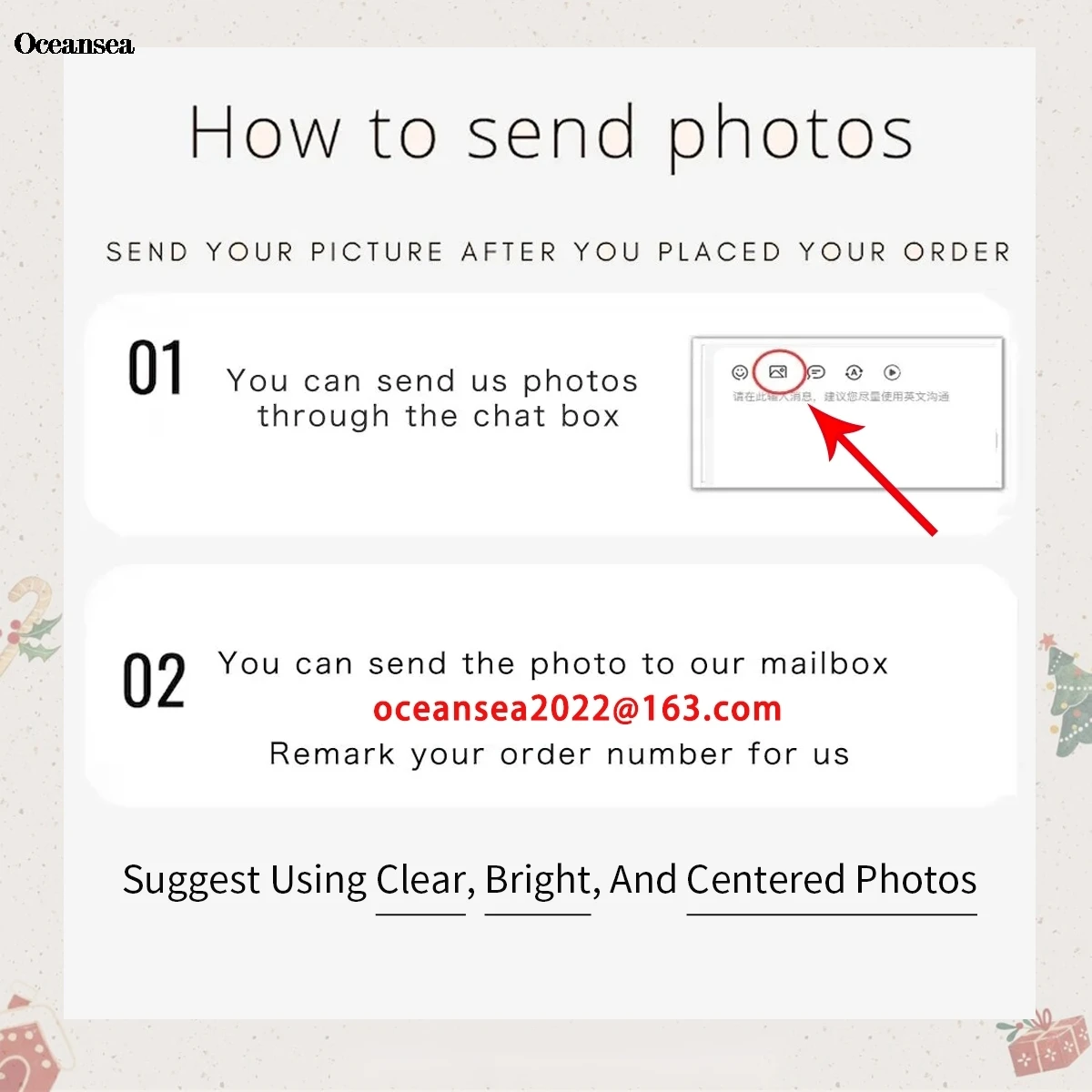 • You can send us photos in the chat box,When uploading your picture please make sure it is a high-quality image.